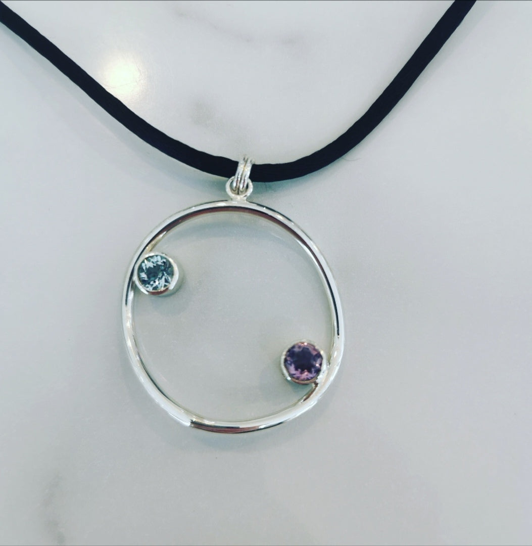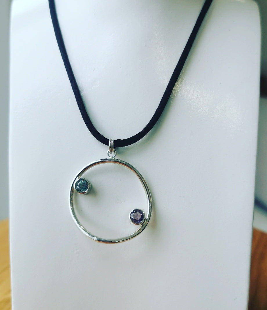 Amethyst and sky blue topaz compliment each other beautifully with this pendant. Hung on a black silk necklet with silver clasp fittings.