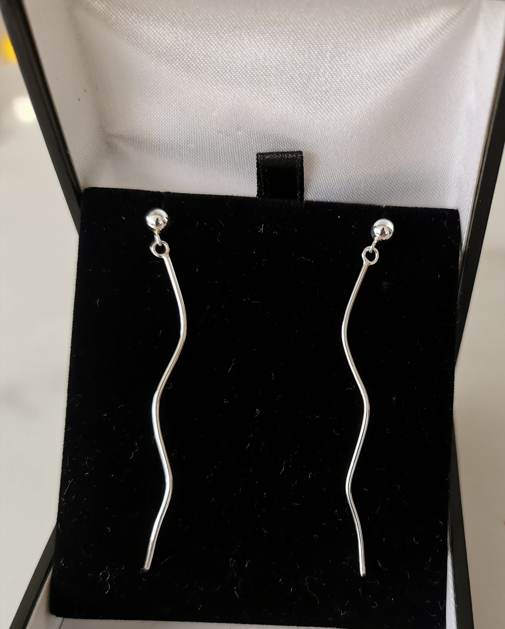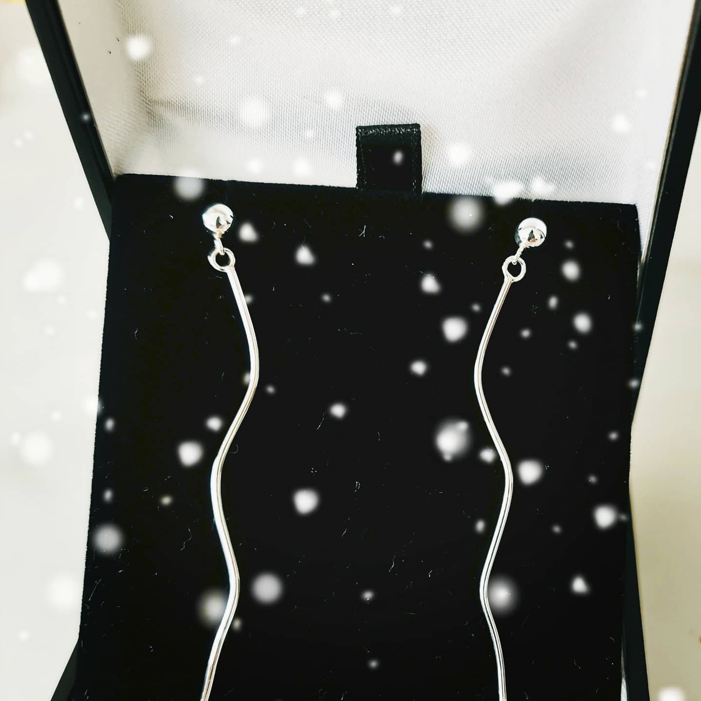These beautiful earrings are made by hand in sterling silver. Approximately 2 inches long and swing from silver stud fittings.