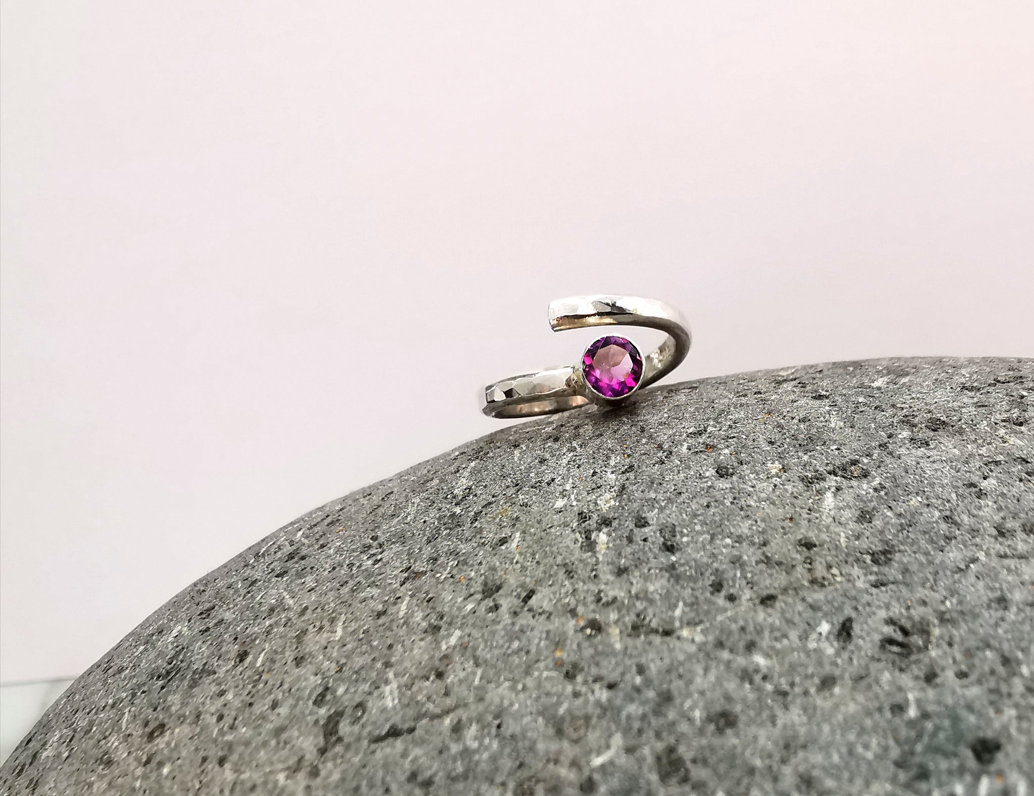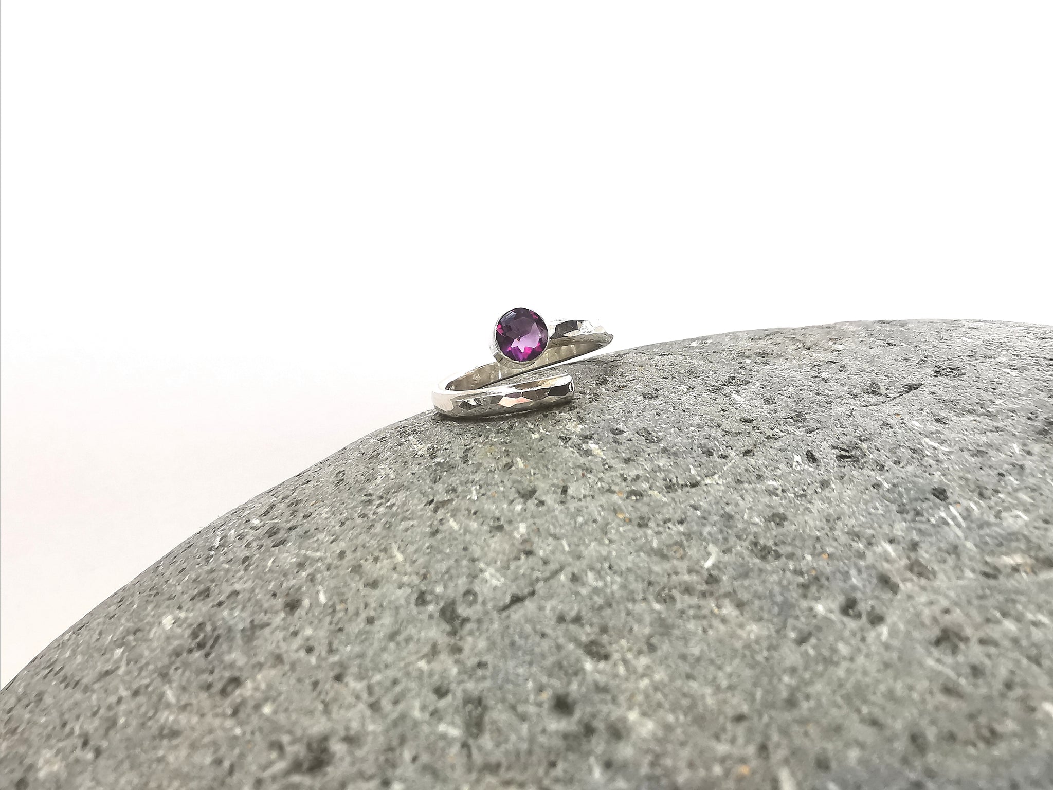 Sterling silver handmade ring with a single amethyst and a hammered finish. Size M