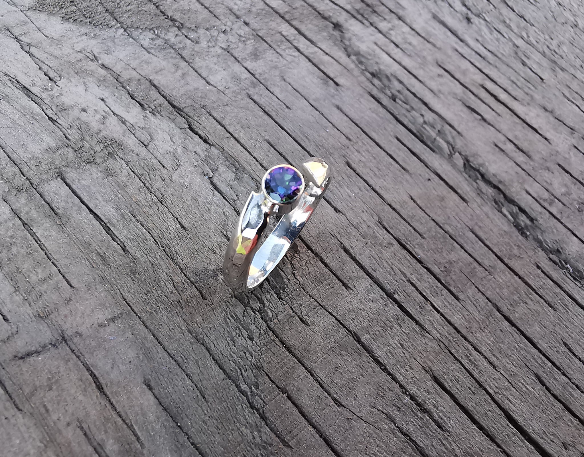 Beautiful sterling silver handmade ring set with a mystic topaz. Size M.